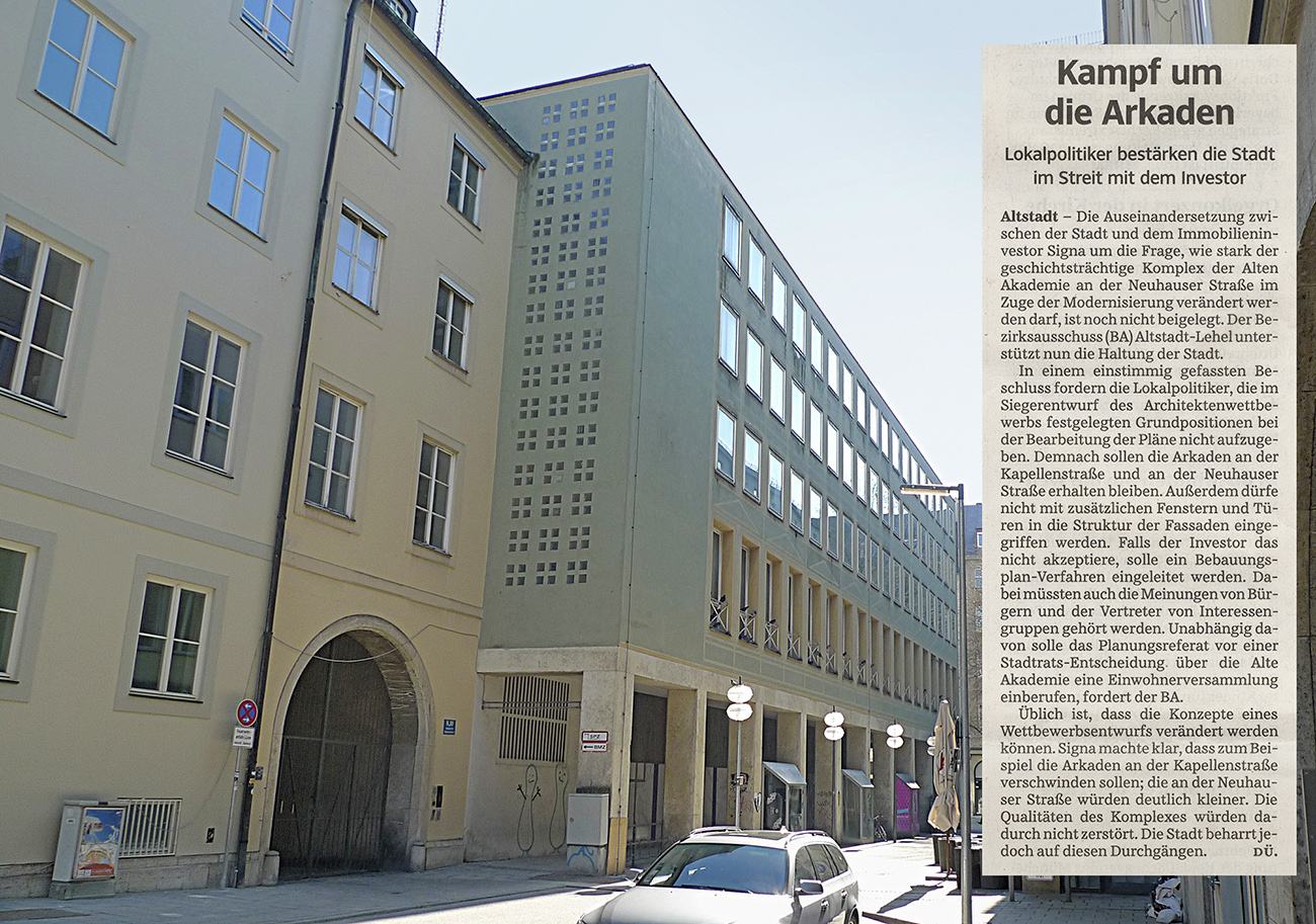 „… Falls der Investor das nicht akzeptiere, solle ein Bebauungsplan-Verfahren eingeleitet werden. Unabhängig davon solle das Planungsreferat vor einer Stadtrats-Entscheidung über die Alte Akademie eine Einwohnerversammlung einberufen, fordert der BA.“