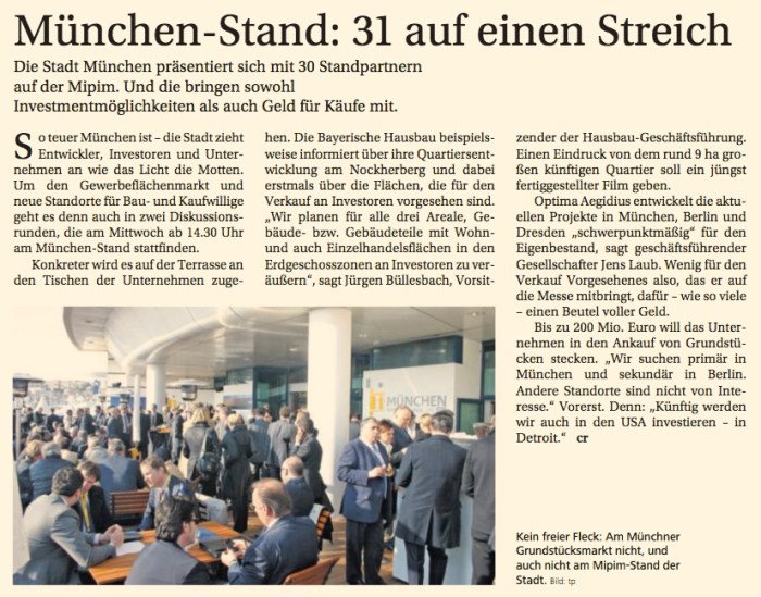Auch unsere Stadt München ist mit einem großen Stand vertreten, dem größten aller teilnehmenden deutschen Städte. Um als Anbieter auf diesem „Markt“ aufzutreten, zum Zeigen des Angebots und zur Stimulierung der Nachfrage – während München in einem ungesunden, unbeherrschten Wachstum steckt: überall in der Stadt entstehen Engpässe, wir ersticken im Verkehr, die Mieten steigen uferlos, Münchner mit wenig Geld sehen sich vertrieben, die Infrastruktur für Eltern, Kinder und Jugendliche kommt nicht nach …  Es wird die rhetorische Frage gestellt: „Ist in München noch Platz für Unternehmen?“  Aber sicher, wir können die letzten landwirtschaftlichen Flächen zubetonieren; alles abreißen, was unter drei Stockwerken ist; noch mehr Straßen und Tunnels bauen. Wir können Bolzplätze zu Bauland machen. Wir können die letzten Brachflächen opfern. Wir haben noch Platz für weitere 100.000 Stinkkarren, für tausende Zweitwohnungen und für Niederlassungen von Finanzdienstleistern und ihre Entourage, die Münchner mit kleinem Bankkonto aus ihren Vierteln verdrängt. Sollten Denkmäler im Wege stehen: sprechen Sie mit uns! Das schöne Wort „Entwicklung“ wird in diesem Zusammenhang zur Bedrohung und zum orwell’schen Herrschaftsbegriff. Platz für die Investoren! Damit sie nicht woanders hingehen! Metropole werden! Wir dürfen nicht zurückfallen! Info der Stadt München