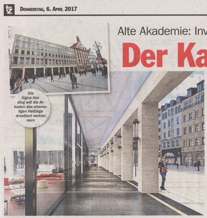 Gibt’s schon hundertmal, ein Standard der gesichtslosen Kommerz-Stadtverschandelung! Wo stehen wir kulturell im 21. Jahrhundert, wenn diese 08/15-Schaufensterpassage eine Antwort sein soll auf den historischen Bestand der Alten Akademie? Was könnte man nicht aus diesem wunderbaren Gebäude mit dem Hettlage-Kaufhaus machen, würde die Stadt (oder der Staat) bedachtsame Bauleute und Künstler im Auftrag und in Beratschlagung mit der Bevölkerung mit Renovierung und Nutzbarmachung beauftragen? Stattdessen soll es SIGNA machen, die nur ihren Umsatz und eine Käuferschicht im Auge hat, deren Erlebniserwartung sie offensichtlich als ganz leicht zu befriedigen einschätzt (bzw. dahin dressiert).