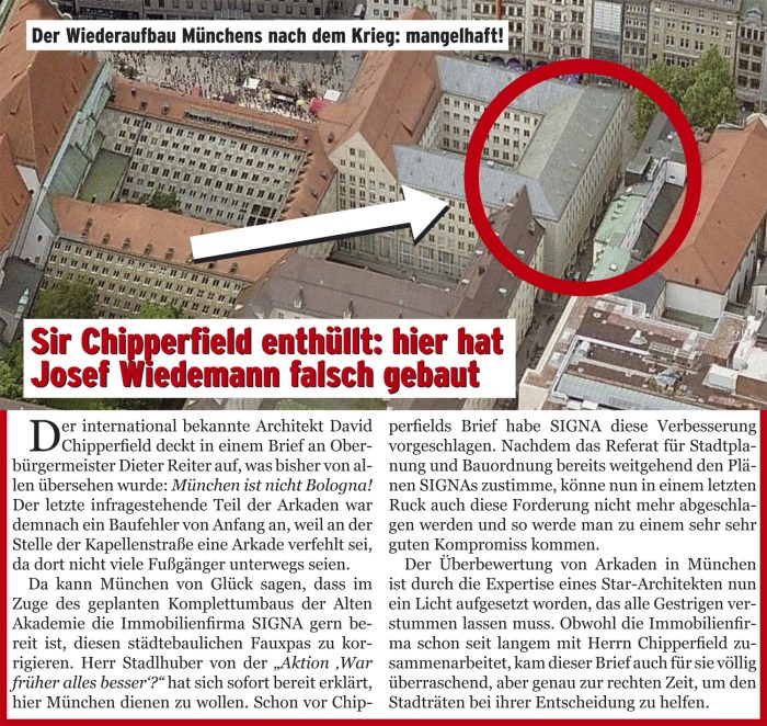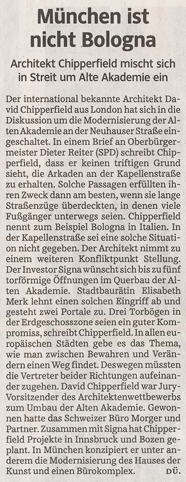 Chipperfields Verbindung zur Alten Akademie ist eine geschäftliche. Er war bestellter Jury-Vorsitzender des SIGNA-Architektenwettbewerbs und hat prominent u.a. mitzuverworten, dass die klare Vorgabe des Stadtrates vom Tisch gewischt wurde: Der Arkadenteil im Kopfbau sollte bleiben, die Jury setzte sich darüber hinweg.