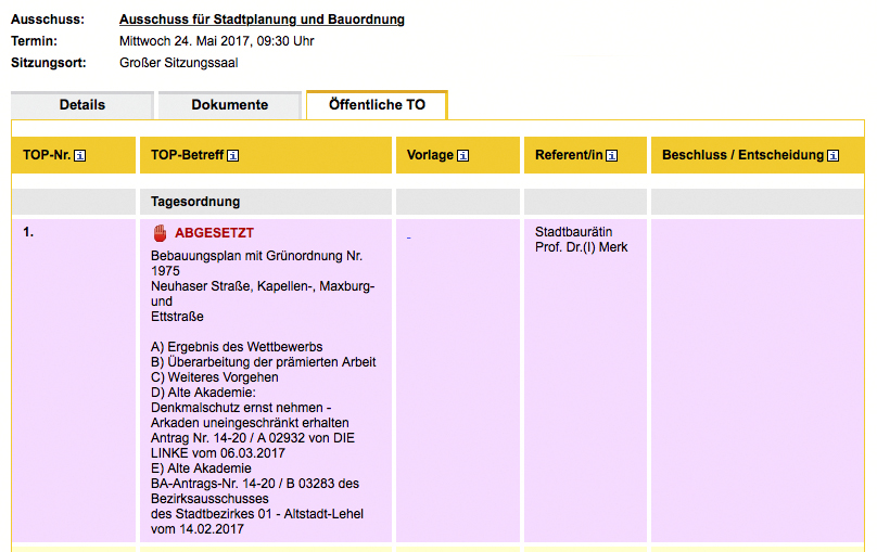Nach gestriger Pressemeldung hat die Tochter des Architekten Josef Wiedemann Urheberrechte an der Gestaltung der Alten Akademie geltend gemacht. Damit ändert sich schlagartig die ganze Situation! Wenn das Recht helfen kann, ein erst vor gut 60 Jahre erneuertes Baukunstwerk vor der Verhunzung zu bewahren, dann soll es auch genützt werden – nachdem an erster Stelle der Staat, dann der staatliche Denkmalschutz, die Stadtplanungsbehörde und involvierte Stadträte diesen Schutz nicht gegeben haben. Nächste Woche wäre wahrscheinlich vom Planungsausschuss des Stadtrats eine Entscheidung pro Zerstörung gefällt worden – alles weitere in dieser Richtung ist abgesagt!