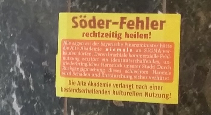 Juristische Aspekte stünden nicht im Vordergrund, sagt Signa-Sprecher Robert Leingruber. Man wolle nun überzeugen, „wie behutsam und sensibel wir bei der Modernisierung der Alten Akademie mit dem Komplex umgehen“. (SZ) Schlechte Aussichten, wenn – ausgehend vom Bauwerk selbst, seiner Kunst und seiner städtebaulichen Qualität – neu diskutiert wird und die Möglichkeiten der Macht, des Geldes, der Verschleierung, der Beziehungsgeflechte dahinter zurücktreten. Die juristische Panzerwaffe, SIGNA-Baurechtsberater Alfred Sauter (Mitglied des Landtags und des CSU-Präsidiums) wird in die hinteren Linien zurückgezogen. Der ausgebuffteste, teuerste und bisher so hilfreiche Anwalt, immer wenn es um staatliche Immobilien geht, hat Pause. In Fachkreisen wird das Vergessen des Urheberrechtsschutzes sprichwörtlich als „Sauter-Panne“. Die Freunde SIGNAs im Rathaus werden eine Umorientierungsphase brauchen, aber das wird sich geben.