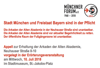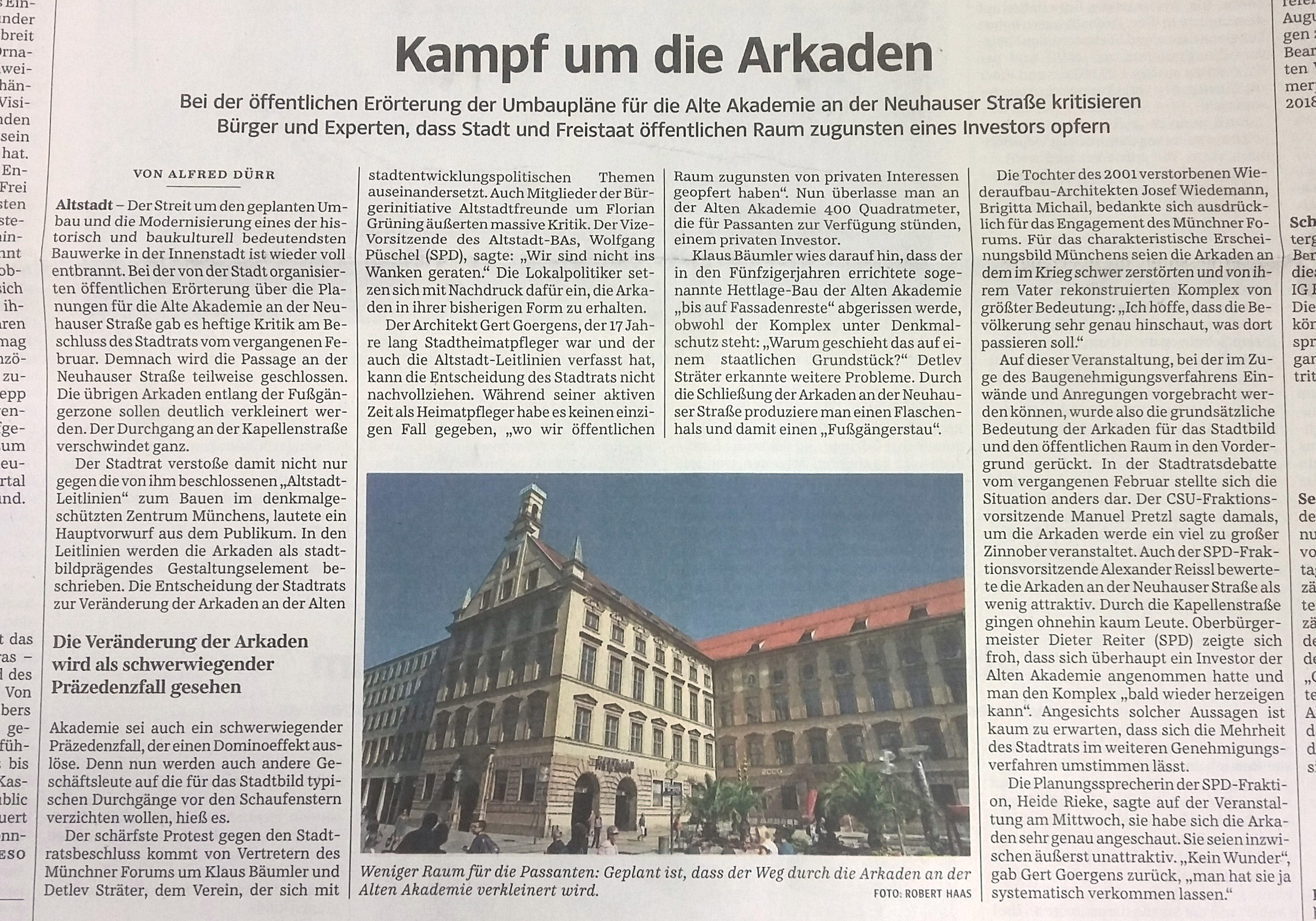 In der Versammlung legte Klaus Bäumler (Münchner Forum) einen Appell zur Abstimmung vor, der fast einstimmig angenommen wurde. Die SZ berichtete wieder einmal unter der Überschrift: Der Kampf um die Arkaden.