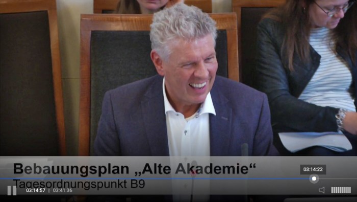 15. Mai – Sieben Minuten im Plenum des Münchner Stadtrats: Schon wieder… In ausgelassener und scherzhafter Weise eröffnet OB Reiter den Tagesordnungspunkt Alte Akademie. Brigitte Wolf von der Partei Die Linke hält eine knappe Gegenrede. Der längste von drei Redebeiträgen kommt zur Schande ausgerechnet vom Stadtratsnazi, CSU/SPD/Bayernpartei schenken sich jedes Wort. Die Verabschiedung des Billigungsbeschlusses im Bebauungsplanverfahren wörtlich: „Es ist noch nicht Mittagspause … Dann frage ich zum Referentinnenantrag nach Gegenstimmen … Damit mehrheitlich so beschlossen.“ Die schweigende Mehrheit hat nicht einmal die Hand zu heben.