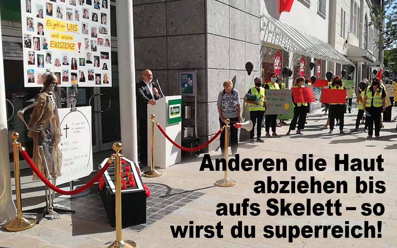Ein Drittel der Häuser wird geschlossen, Tausende langjährig Beschäftigte werden auf die Straße geworfen. Insolvenz in Eigenverantwortung – das wunderbare Werkzeug, um Tarifverträge aufzukündigen, die Entlassenen um ihre Abfindung zu prellen und andere Rechnungen nicht bezahlen zu müssen. Sein Vermögen braucht Benko nicht anzutasten! Möglicherweise macht er noch einen Reibach aus dieser Situation: durch Lohnraub, Erpressung von Vermietern und Lieferanten, durch Immobilienverkäufe und Geschenke der Politik.