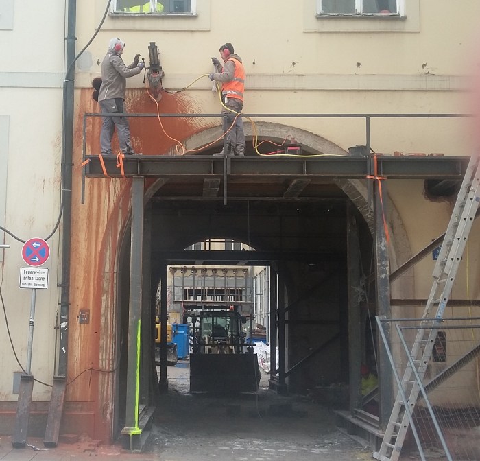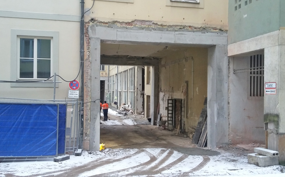 Das Denkmal wird der neuen Nutzung angepasst: statt des offenen Torbogens wird eine eingehauste Ladezone und Einfahrt zur Tiefgarage von kommerziellem und technischem Fortschritt künden – es lebe das Rolltor …