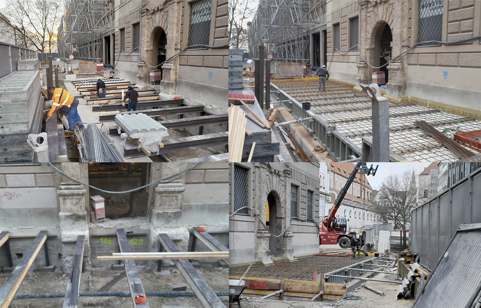 Die Bilder zeigen, was gerade hinter dem Bauzaun passiert. Damit der Kopfbau nicht ins Wanken gerate, wird aussen zur Stabilisierung ein Betonblock ans Fundament gegossen. Am Ablauf der Bauarbeiten war zu erkennen, dass das ursprünglich so wohl nicht vorgesehen war. Sieht aus nach einem bautechnischen Extremversuch – verursacht durch zahlengetriebenes Den-Hals-nicht-vollkriegen.
