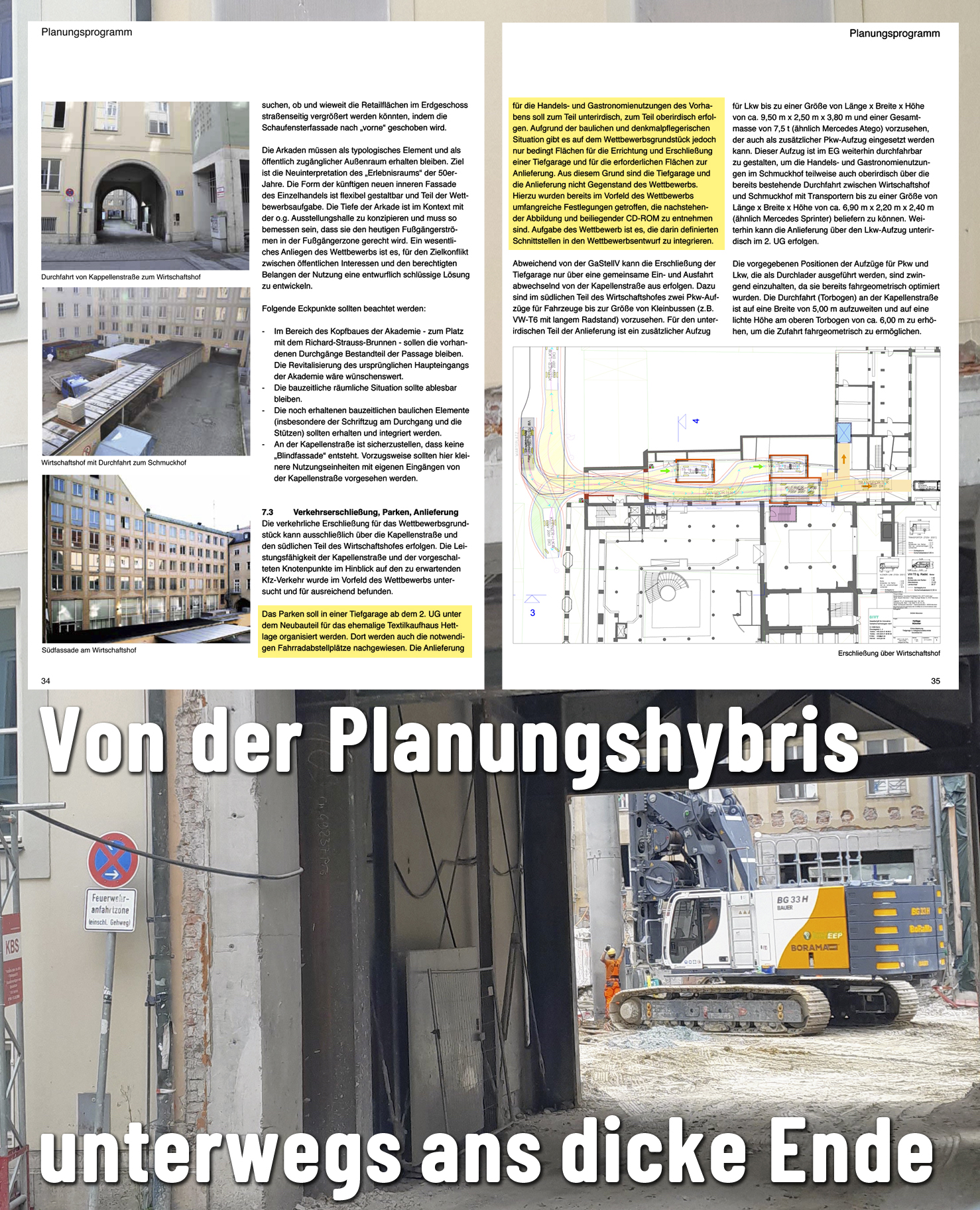 Und während die in der Immobilien-Goldgräberzeit ausgedachte Umnutzung und Verwertung der Alten Akademie zum Fiasko wird und selbst jede geschäftliche Erfolgsaussicht verloren hat, plant Benko an der Schützenstraße die nächste Hybris in noch größerem Maßstab. Mit Bruch des Versprechens, den Kaufhausstandort zu erhalten, mit Rauswurf der Belegschaft und dem Szenario eines typischen Chipperfield-Blocks … Der Münchner Stadtrat muss seine Benko-dienstbare Haltung aufgeben, der Verlust der Alten Akademie mahnt!