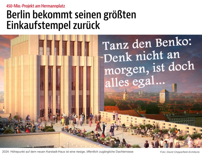 „Deutschland schleppte sich durch die letzte Januarwoche, als René Benko (41) in seinen Büroturm Upper West am Berliner Ku’damm lud. Die Führung seiner Unternehmensholding Signa und der Vorstand der Gewerkschaft Verdi trafen sich zum abendlichen Spitzengespräch, es ging um die Zukunft von Karstadt und Kaufhof, beides inzwischen im Besitz Benkos. Das Treffen dauerte mehr als acht Stunden, bis nach zwei Uhr morgens. Wenig überraschend, dass es keine Einigung gab. Die Gewerkschaftsbosse Frank Bsirske (67) und Stefanie Nutzenberger (55) opponierten pflichtgemäß gegen den anstehenden Personalabbau und die geplanten Tarifkürzungen.