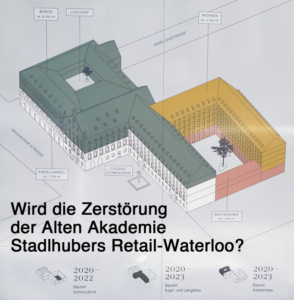 Im Mai 2020 war Baubeginn – und nun im Juli 2022 steckt das Projekt noch immer im Rohbau. Untergeschosse, der bis auf ein Fassadenskelett abgerissene Hettlage-Teil und ein komplett neues Dach sind noch nicht angefangen, der Zeitplan völlig gerissen. Soweit – die Alte Akademie als das, was sie war und hätte werden können – verloren. Herr Stadlhuber kann das auf sein Macher-Konto buchen. Wie geht es weiter? Hat sich da jemand verhoben?