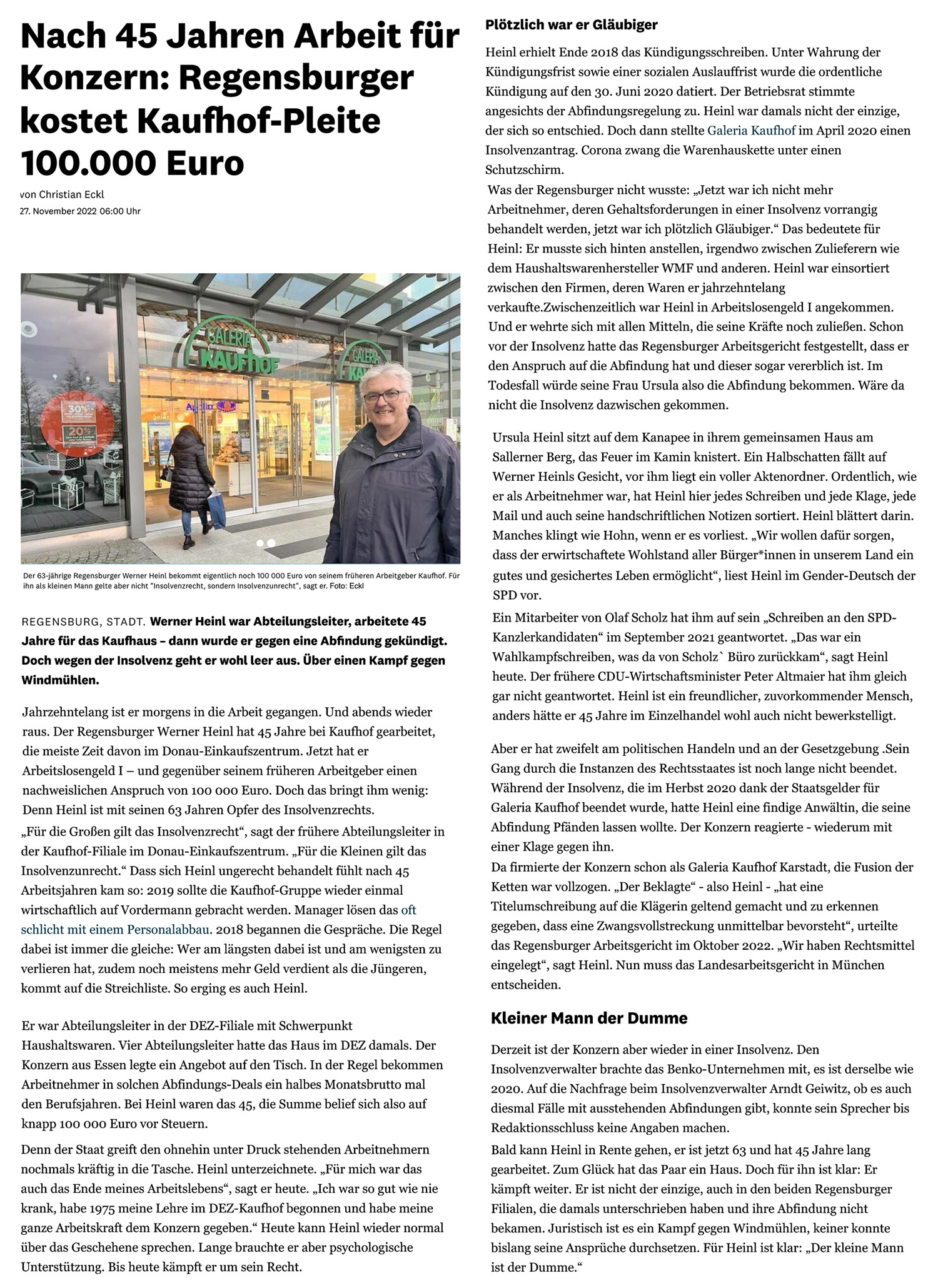 Die Mittelbayrische Zeitung veröffentlichte am Wochenende einen Bericht über einen Abteilungsleiter, dem als Sparmaßnahme 2018 gekündigt worden war – nach 45 Arbeitsjahren für Kaufhof. Mit den Fristen entsprechend der Betriebszugehörigkeit endete das Arbeitsverhältnis 2020 erst nach Beginn des Insolvenzverfahrens. Dadurch wurde er zum „Gläubiger“ und muss nun vor Gerichten um die ihm zustehende Abfindung kämpfen, der Ausgang ist ungewiss. Hier der ganze Artikel.