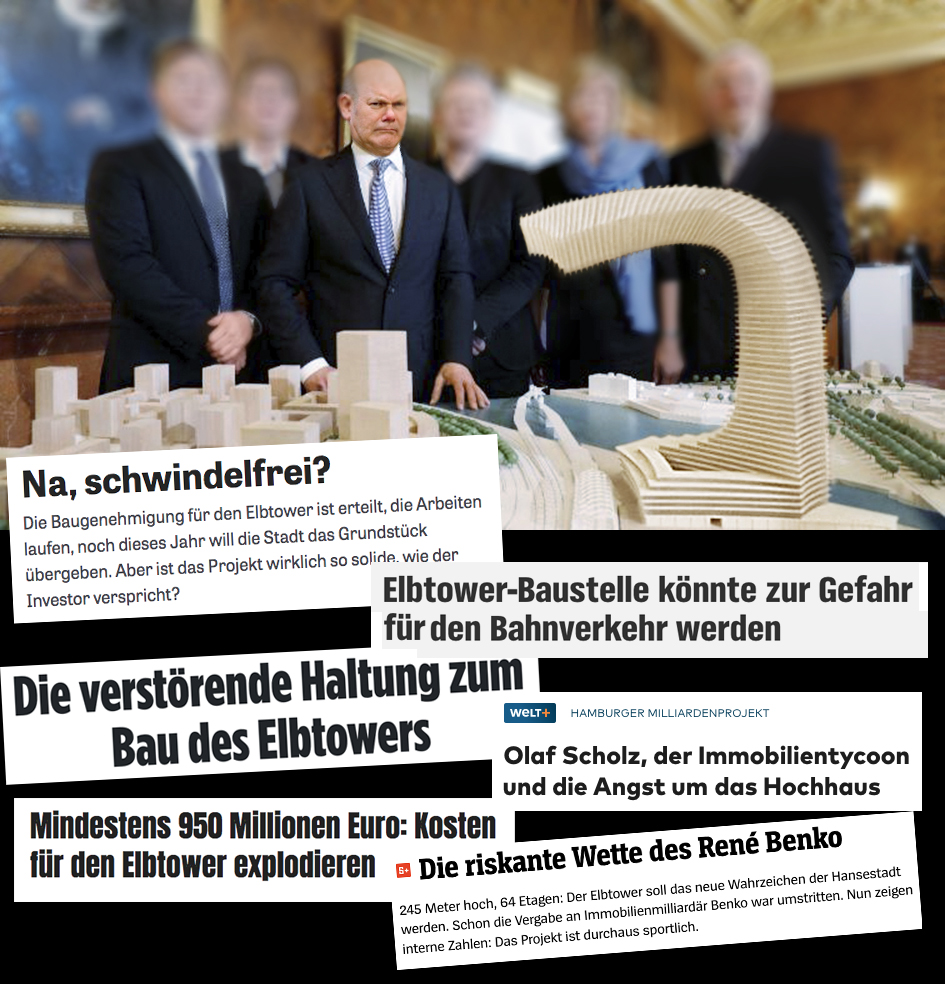 * Siehe Hamburg. Der Harakiri-Bau des Elbtower soll nächste Woche endgültig durch Rot/Grün fixiert werden. Der arrogante SIGNA-Vorstand Timo Herzberg kann sich da auf seine Gesellen verlassen: „Bei aller Vorfreude hat Herzberg aber auch die Kritiker im Blick – und teilte gegen „zwei Bürgerschaftsabgeordnete“ aus, deren Namen er nicht nannte: Die würden mit ihren Äußerungen gegen das Projekt nur Aufmerksamkeit erzielen wollen. Den Bau könnten sie damit aber auch nicht mehr verhindern.“ (Hamburger Morgenpost)