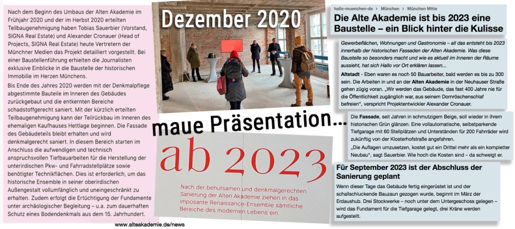 Im Grunde ist zu konstatieren, dass in den zweieinhalb Jahren seit Mai 2020 nur abgerissen und dekonstruiert wurde. Was ist los mit einem der bedeutendsten Denkmäler der Stadt München? „Die Alte Akademie wird 2023 in neuem Glanz erscheinen … Bis das Ensemble eröffnet, liegt noch ein Weg vor uns und wir möchten Sie bis dahin transparent über den Baufortschritt und die damit einhergehenden geplanten Maßnahmen frühzeitig informieren.“ (https://alteakademie.de/baustelle/