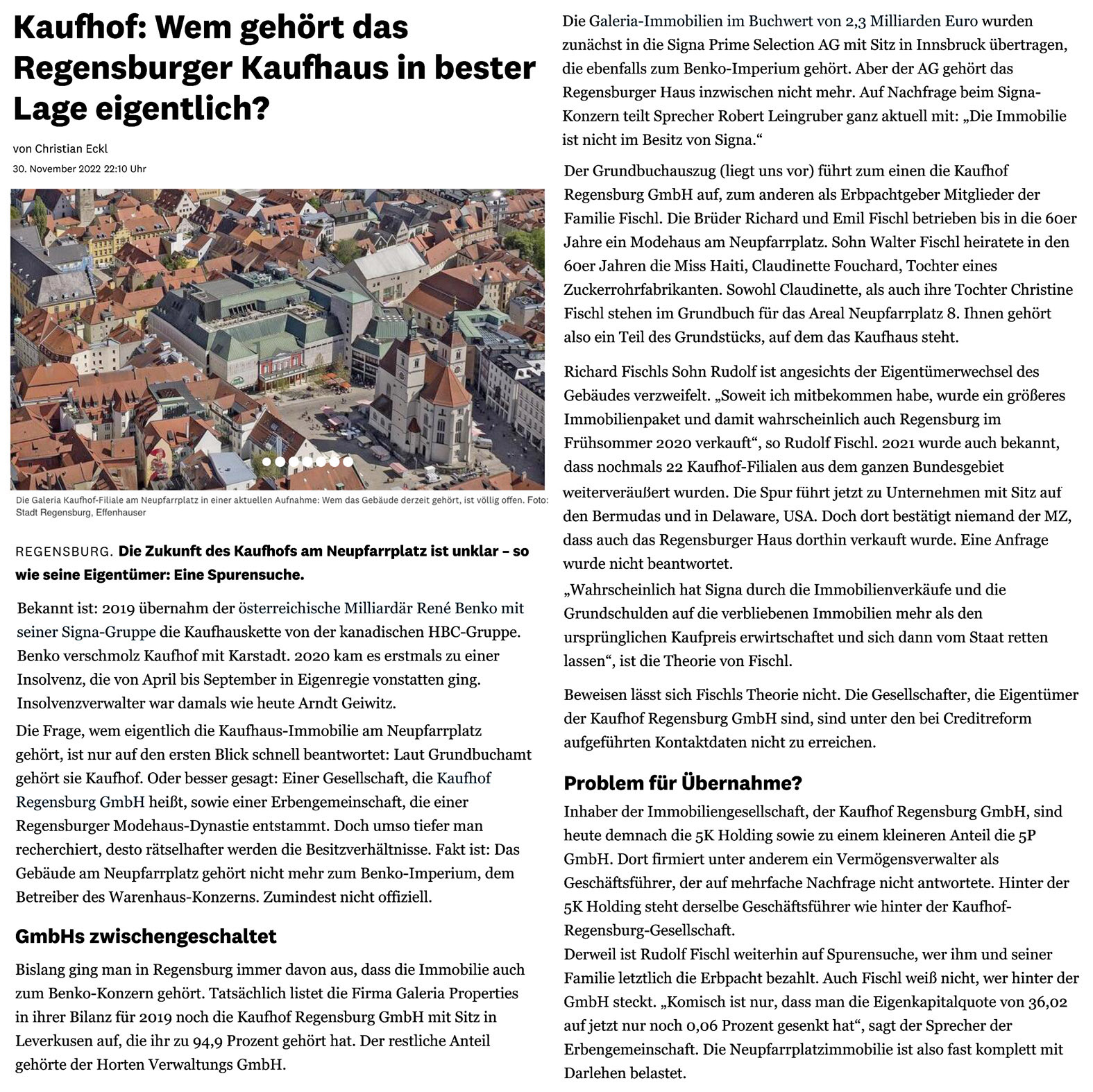Das Kaufhofgebäude am Neupfarrplatz ist als Eigentum auf Wanderschaft, von wo nach wohin hat ein Regensburger Bürger versucht herauszufinden, dokumentiert in einem Artikel der Mittelbayerischen. Es hat sich – allerdings nur für die Öffentlichkeit – im Weg durch das Konzerngespinst von René Benko verloren, die Spuren weisen nach Bermuda oder Delaware/USA. Eigentlich sollte es sich als Vermögen in der Insolvenzmasse von Galeria Kaufhof Karstadt befinden, zur Absicherung der Ansprüche von Gläubigern und Belegschaft. Ein Einzelfall? Die Vermutung geht in diese Richtung: