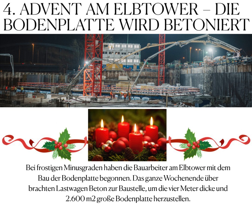 Für den Elbtower, den René Benko und Olaf Scholz der Hansestadt Hamburg aufs Auge gedrückt haben, wurde am 4. Advent (der Christen an die Ankunft des Erlösers erinnert) geklotzt: 11.000 Kubikmeter Beton wurden stolz zur Bodenplatte vergossen*. Mit den noch mehr Kubikmetern für die Stützpfähle darunter und der Bodenplatte für den restlichen Sockel, multipliziert mit dem Gewichtsfaktor 2,5 kommen leicht 100.000 t Beton zusammen – noch bevor eine Wand hochgezogen ist. Da hat sich nicht viel getan, Wolkenkratzer sind Technologie des 20. Jahrhunderts. (Insgesamt verbraucht der Elbtower 118.000 Kubikmeter Beton und 27.000t Baustahl) Für den Wohnturm ONE in Frankfurt wurden 2019 8.000 Kubikmeter und für die Bodenplatte des „Uptown“ in Moosach 2001 7.200 Kubikmeter versenkt. Diese Menge ist für die zwei geplanten Türme, die Herr Büschl der Stadt München „schenken“ will, doppelt zu veranschlagen.