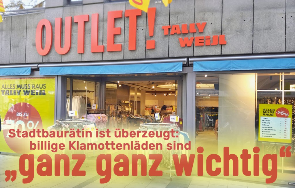 „Ich hab auch nix gegen die billigeren Klamottenläden, muss ich auch sagen, finde ich ganz, ganz wichtig …“* Gesprochen hat ihn Elisabeth Merk, die Münchner Stadtbaurätin (die selber keine billigen Klamotten kaufen würde und sich so einen kleinen Aha!-Effekt verschaffte).