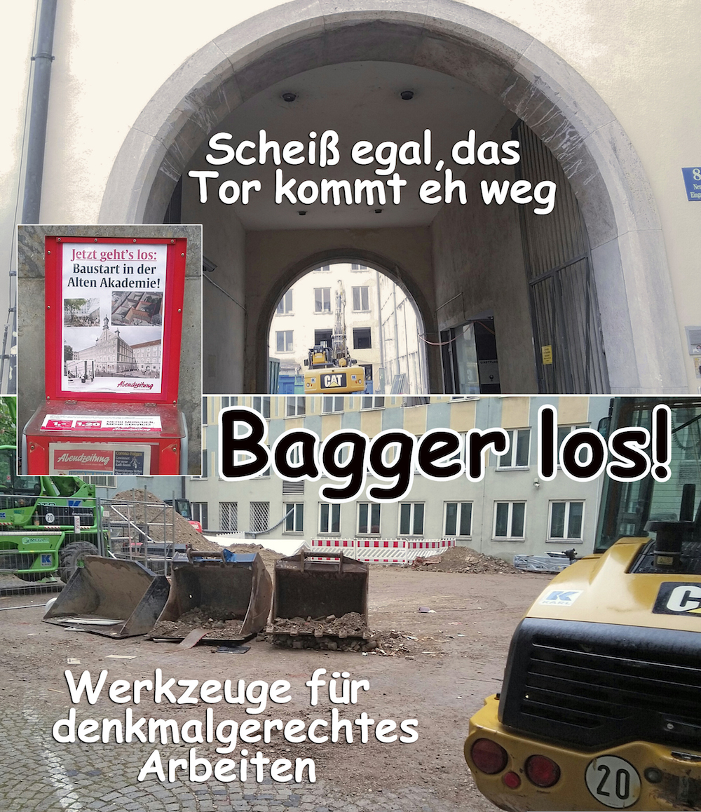Die Abendzeitung leistete sich einen Tiefpunkt des Journalismus. Vielleicht weil der Lokalteil noch nicht voll war, machte man es sich leicht: „An der Alten Akademie wird jetzt gebaut. Wie René Benkos Projektentwicklungsunternehmen Signa gestern mitteilte, sind die Arbeiten „im Inneren des Ensembles“ angelaufen.“ Und dann wird abgeschrieben, als sei die AZ ein Mitgliederjournal der Immobilienmafia; als könne man in München, wo die Spekulanten ihr Unwesen treiben und man die Bayerische Hausbau, Büschl u.a. kennt, in deren verdrehten Falschinformationen mehr als 1% Wahrheit finden. Keine Mühe gemacht, keine Recherche, keine Erinnerung an die vielen widersprechenden Stimmen, kein Nachfragen … traurig, Betrug an den Leser*innen, die glauben, was in der Zeitung steht.