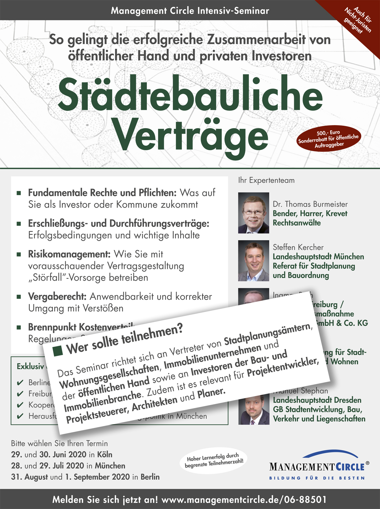 „Die Sitzung des vorberatenden Ausschusses für Stadtplanung und Bauordnung vom 12.02.2020 konnte nicht erreicht werden, da die Prüfungen des Angebots zum Abschluss eines städtebaulichen Vertrags zu diesem Zeitpunkt noch nicht abgeschlossen waren. Eine Behandlung in der heutigen Sitzung der Vollversammlung ist jedoch erforderlich, weil das Angebot der Erbbauberechtigten zum Abschluss des städtebaulichen Vertrages mit einer Ablauffrist abgegeben wurde.“  (Seite 1)