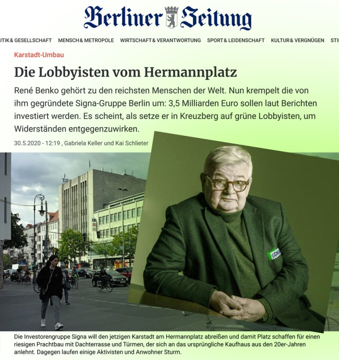 In einem ausführlichen Artikel der Berliner Zeitung wird die Lobbyarbeit von SIGNA geschildert – sowohl auf Politiker*innen wie die Öffentlichkeit gerichtet. Von schweren Geschützen wie einem Joschka Fischer bis zu windigen Vorspiegelungen, SIGNA würde sich um den Fahrradverkehr im Viertel kümmern.