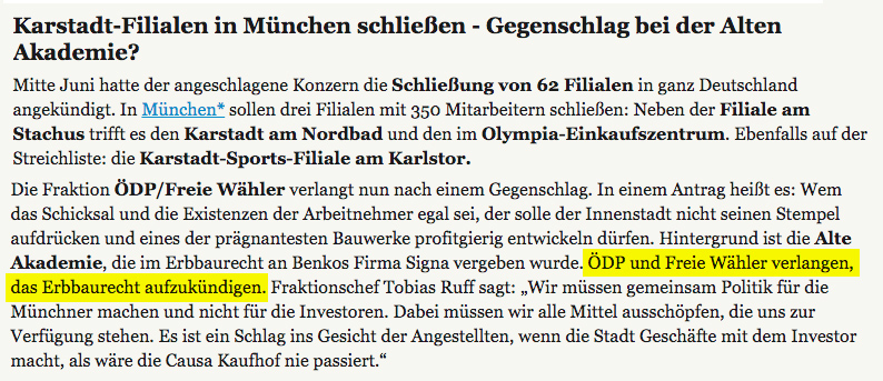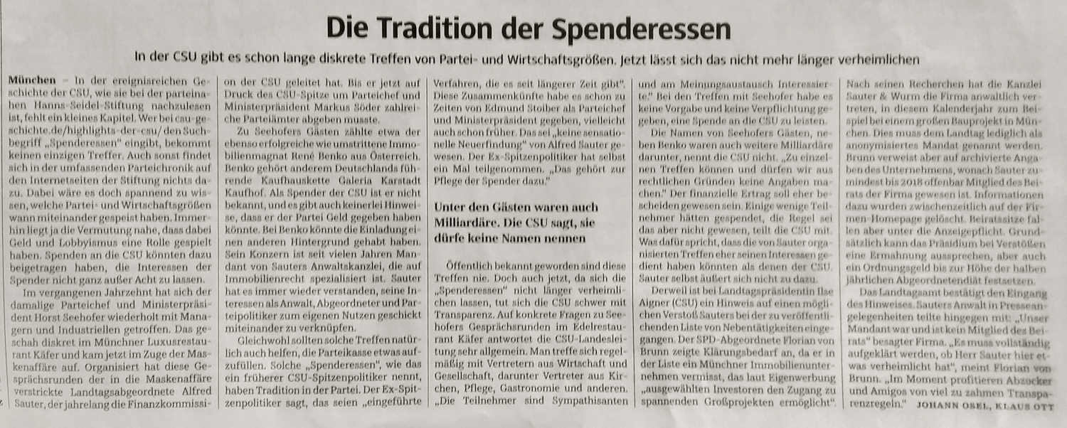 Über den persönlichen Bereicherungen von Alfred Sauter darf man nicht vergessen, dass er als einer der Häuptlinge der CSU bis gerade eben seine Fäden gezogen hat. So arrangierte er regelmäßig Abendessen von Milliardären mit dem Vorsitzenden der CSU. Kann sein auch für Söder, bestimmt wissen tut man nun von einem Treffen Benko / Seehofer. Nachdem Benko seit einigen Jahren eher Berlin und Hamburg heimsucht (wo er dann wohl seine Treffen mit SPD-Bürgermeistern hat) könnte das gewesen sein, als er sich das Aktionsfeld München erschloss. 2013 bekam er den Zugriff auf die Alte Akademie aus den Händen des bayerischen Staates. Wer mit wem und über was bei dem Essen gesprochen wurde, bleibt im Separee, andernfalls würden ja die Rechte von René Benko verletzt werden …